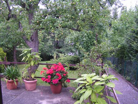 Vor dem Haus befindet sich eine Terrasse mit Gartenmöbeln und einer Liegewiese.